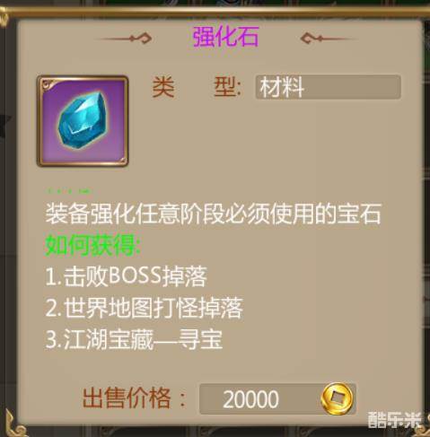 强化石,装备强化必备材料,可通过游戏击杀boss,打怪或寻宝获得。