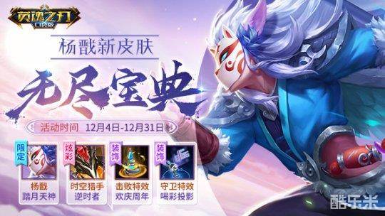 12月4日-12月31日,无尽宝典(第23期)开启,只需388点券即可获得10倍超值返利!更有杨戬-踏月天神限定皮肤、欢庆周年击败特效、喝彩投影守卫特效等多种奖励等你来拿!