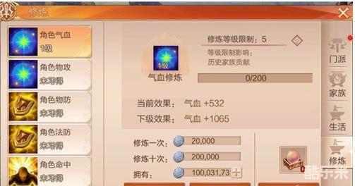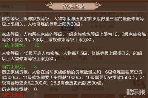 修炼上限 :家族等级、人物等级、历史家族贡献均会影响当前的修炼等级上限,具体修炼等级上限由当前最低的等级上限决定。
