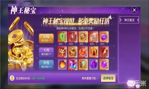 神王秘宝抽奖活动来袭啦!神王秘宝活动的目的是为玩家提供一个可以选择自己心仪物品,并凭借运气将其从卡池中抽出的机会。玩家每次抽奖都可以从S、A、B不同稀有度的物品中,分别挑选出自己最心仪的1、2、3种,然后再加上系统随机分配的3种物品,共9张卡牌,翻面并随机打乱,玩家每次只需要消耗一定数量的元宝就可以翻开其中一张卡牌并获得相应的物品,直到打开所有的卡牌为止,有需求的神王大人千万不要错过本周的活动啦。