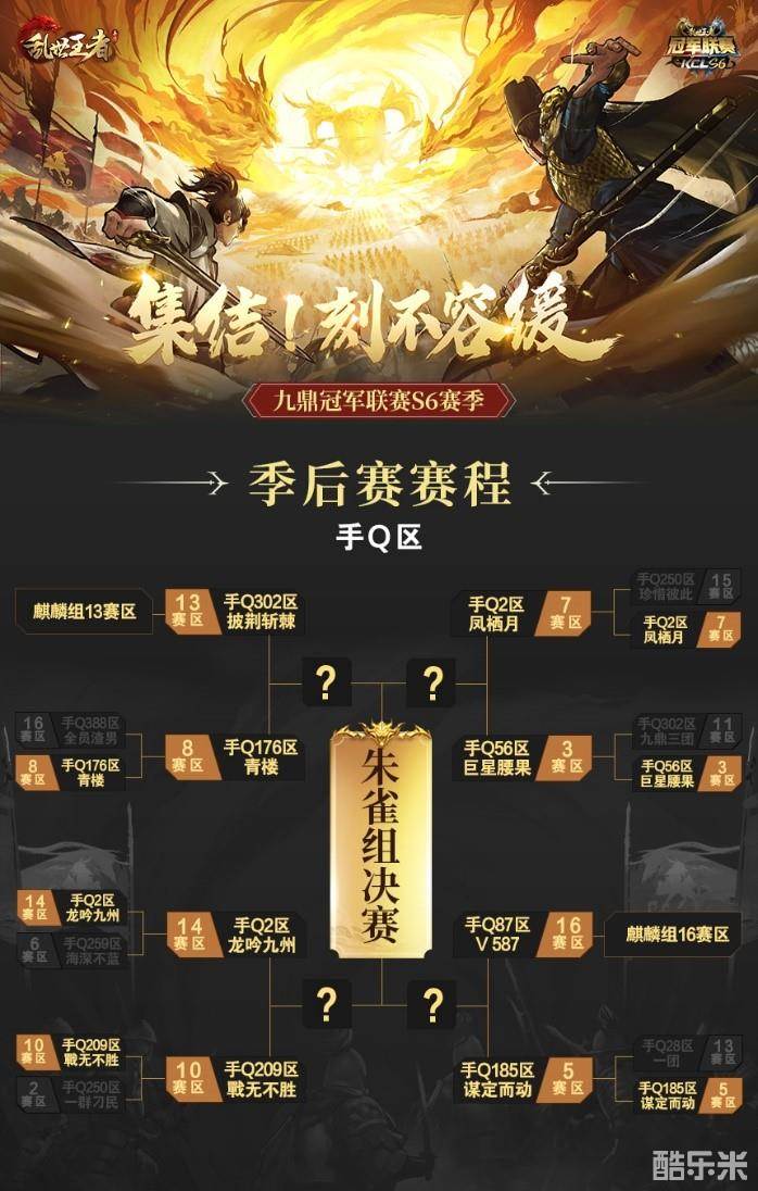 11月29日,腾讯首款战争策略手游《乱世王者》九鼎冠军联赛S6季后赛已经正式开启,来自麒麟组和朱雀组的32支队伍在上周进行了强强对话。至此,第一轮的季后赛已经在硝烟中结束,突围而出的16强名单也已火热出炉,他们将按照分组规则继续两两对决。