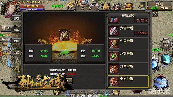 玩家在《烈焰龙城》在主界面点击‘神炉’,再选择左侧‘护盾’即可进入界面;护盾需要使用一定的护盾碎片兑换并升级,护盾碎片可通过每日副本,打怪掉落,商城购买,游戏活动等途径获得。护盾分为十级,等级越高的护盾能够提供给角色更高的物理和魔法防御加成,护盾可强化注灵,抵御危险,无敌守护。