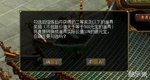 除此之外,为了提高玩家的游戏体验,在进行熔炼之前,各位道友们可勾选转换元宝功能。则在熔炼仙丹过程中,玩家在获得的二等奖及以下道具奖励时,除价值大于等于500元以上道具或元宝奖励外,系统将直接为玩家转换成道具实际价值的10%的元宝。