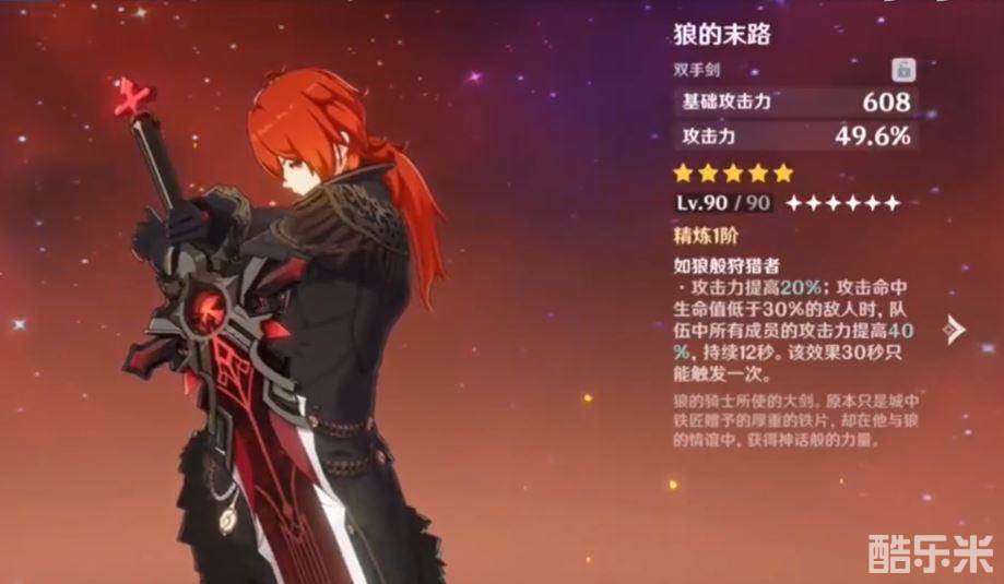 1、原神90级狼末的属性面板如下图所示,为【608基础攻击力+49.6%攻击力加成】,80级的面板为【532攻击力+45.3%攻击力加成】,由于武器的白字攻击力会受到圣遗物等各种放大,因此提升还是比较明显的。