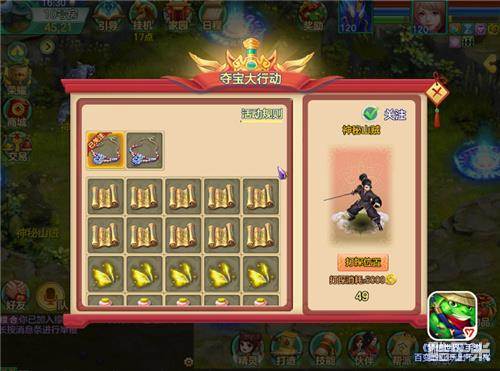 据听说有一些怪物携带着宝贝偷偷来到了人间,侠士们可以前往打探宝物的消息。怪物身上有必定携带高级必杀的护符,高级兽诀以及更多奖励,而且奖励是全队人都会获得的喔!但是奖励有限,究竟少侠你能否成为那个幸运儿呢?快来参加夺宝大行动吧!各位少侠可于“日程-夺宝大行动”处了解详情。