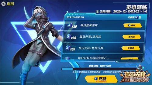 《孤岛先锋》还开启了全新活动“英雄降临”,在2020年12月10日至2021年1月6日期间,玩家可以免费试用幽灵猎手,同时完成每日指定任务,为进度条“充能”,只要在活动截止前充满进度,即可获得幽灵猎手的永久使用权。
