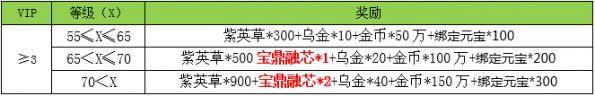 活动期间内,凡VIP等级≥3,且角色等级达到以下要求的玩家,均可获得宝鼎材料奖励。