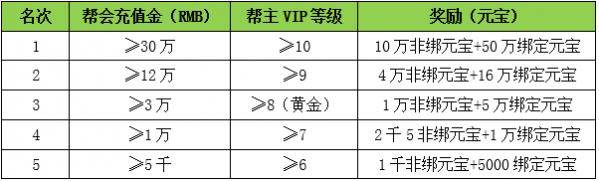 活动期间内,将以帮派为单位进行充值评比,符合以下全部条件,其帮主可领取非绑定元宝+绑定元宝奖励。