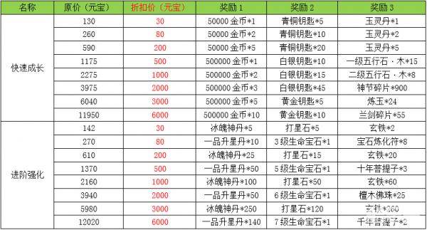 活动内容:玩家可以通过较低的元宝获得更高价值的成长道具和强化道具。