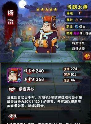 杨戬是群体晕眩谋士,技能是对随机3名敌将造成相当于施法者攻击力50%的伤害,并有20%概率附加眩晕效果,持续2回合。是除了神将关胜群体眩晕几率最高的武将,晕杀技能必备武将。