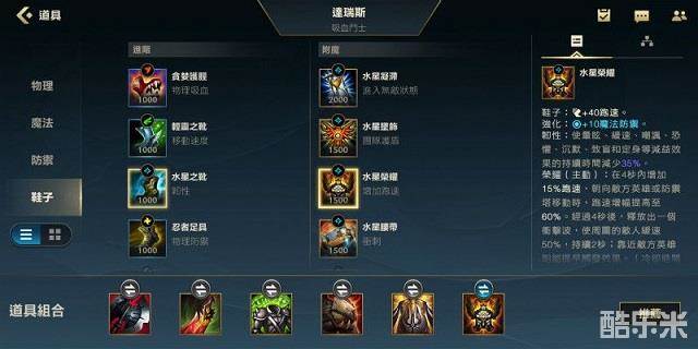 最后一件根据对方阵容选择装备,如果对面有亚索、金克斯等很多暴击英雄的时候,咱们选择出兰顿这件装备。如果两种输出各有的情况下,咱们出血手就行。然后鞋子方面将魔抗鞋升级成正义荣耀,因为正义荣耀有主动加速的效果。