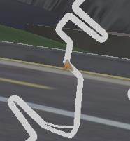 这处S弯赛道以两侧的墙壁凸起为界限,是可以看做一个狭窄的平直赛道的。这里需要解决的就是赛车在入弯时的车头朝向问题了。如上图所示,可以通过一个停滞漂移接断位漂移的技巧将车头朝向矫正。漂移时点击刹车键触发停滞飘移,在能够直线进入弯道的位置时,快速的点击左方向键拉车头,同时点击漂移键即可触发断位漂移。这样赛车在进入弯道时的车头朝向就比较理想了,只要通过转向进行细微的调整即可。