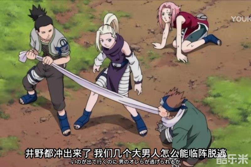竞争对手井野的队伍出现在独自一人跟音忍们战斗的小樱面前!一直躲在树丛后偷看的井野等人终于走出来协助小樱。他们使出队伍的”猪鹿蝶“阵式追迫音忍们…井野将同伴拉入战场,丁次似乎表示有点不情愿,井野在劝说我们是同伴嘛,帮帮忙嘛,丁次还是表示不要,他表示自己不想死,萨克开始欠欠的说话了,滚吧,肥猪。