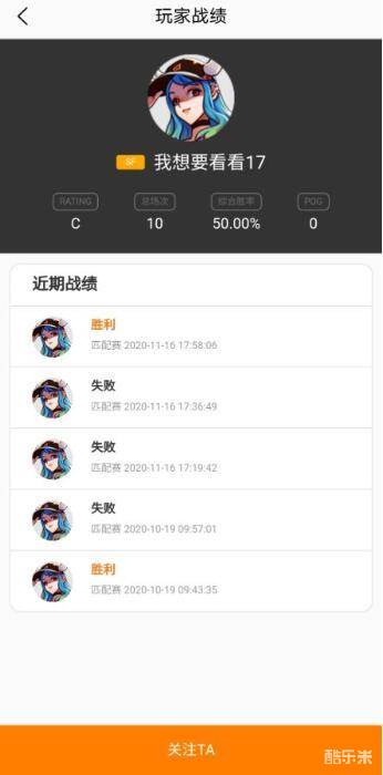 在战绩列表中,选择一场对局进入比赛详情界面,点击一位角色头像,通过【关注】按钮,即可