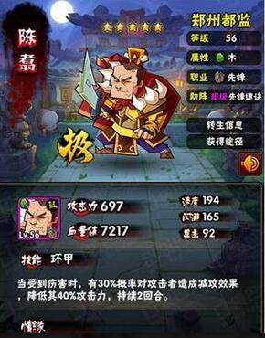 解析:陈翥作为一个先锋,属于肉盾型的存在。属性也比较一般,但是技能很不错。可以对攻击者造成减攻,两回合最高降低80%的攻击力,在这样的情况下,给了整个阵容喘息的机会,尤其是对方攻击力很强的情况下。但是陈翥的问题也在于不好配缘,同时没办法组成一个主流的阵容。小编不是推荐,除非玩家们想组成左八都监的阵容。