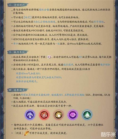 活动开始时,降妖师可挑选8只妖灵带入地图,从边缘处的初始地块向右上角的地宫进发,每个地块上都有妖怪守卫,将其击败后就能选择占领该地块,降妖师控制的地块相连后还可共享领地,分享地块上产出的灵装和剑星。活动中,所有妖灵将提升至最低3阶,被动属性9和满级等级,并归属于大妖、神瑞、兽灵、异界和自然五大流派之一。每个流派有六个灵装槽位,降妖师消耗剑星合成灵装并装备至槽位后就能提升该流派所有妖灵的实力。装满六个槽位,更能提升流派等级,获取更强大的属性加成。