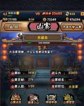 玩家们可以在山寨大厅进行哥哥们可以在“山寨大厅”进行查看山寨信息与成员、邀请成员、审核成员、修改山寨公告等,部分权限仅有管理层才有;