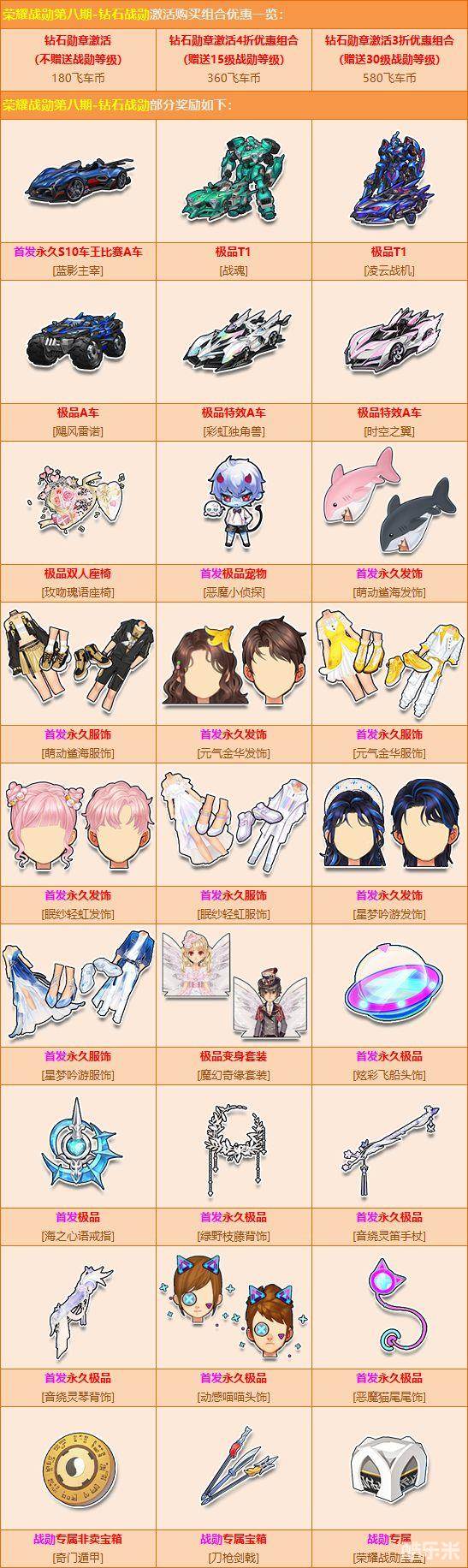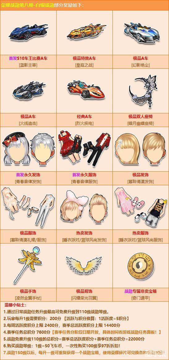 参与荣耀战勋第8期,有机会获得首发主题A车【蓝影主宰】、极品A车【飓风雷诺】、首发极品宠物【恶魔小侦探】、首发永久【萌动鲨鱼/元气金华/眠纱轻虹/星梦吟游发饰/服饰】、首发永久【音绕灵笛手杖/炫彩飞船头饰/绿野枝藤背饰】。除以上极品外,还有机会获得极品道具【荣耀战勋宝盒】,开启可获得荣耀碎片,使用荣耀碎片即可兑换以下极品奖励: