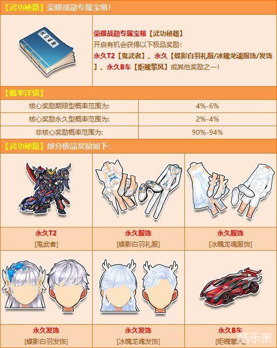 另外,开启荣耀战勋专属宝箱【武功秘籍】,有机会获得永久T2【鬼武者】、永久【蝶影白羽礼服/冰魄龙魂服饰/发饰】、永久B车【炬魄擎风】或其他奖励之一!