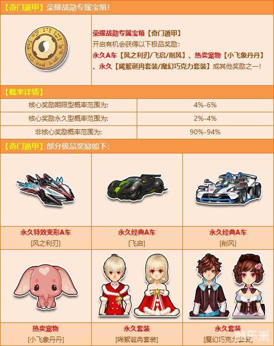 开启荣耀战勋专属宝箱【奇门遁甲】,开启有机会获得永久A车【风之利刃/飞启/削风】、永久【唏絮诞冉/魔幻巧克力套装】、永久宠物【小飞象丹丹】或其他奖励之一!