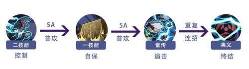 短按二技能起手控制,如果未命中敌人则用一技能反手自保。技能命中敌人后衔接5A,再配合分身使用雷传,当敌人血量达到斩杀线时释放奥义技能终结对手。