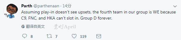 如果入围赛一切正常的话,第四支加入我组的队伍应该WE,因为C9、FNC和HKA都不能进这个组。我们永远都是D组。