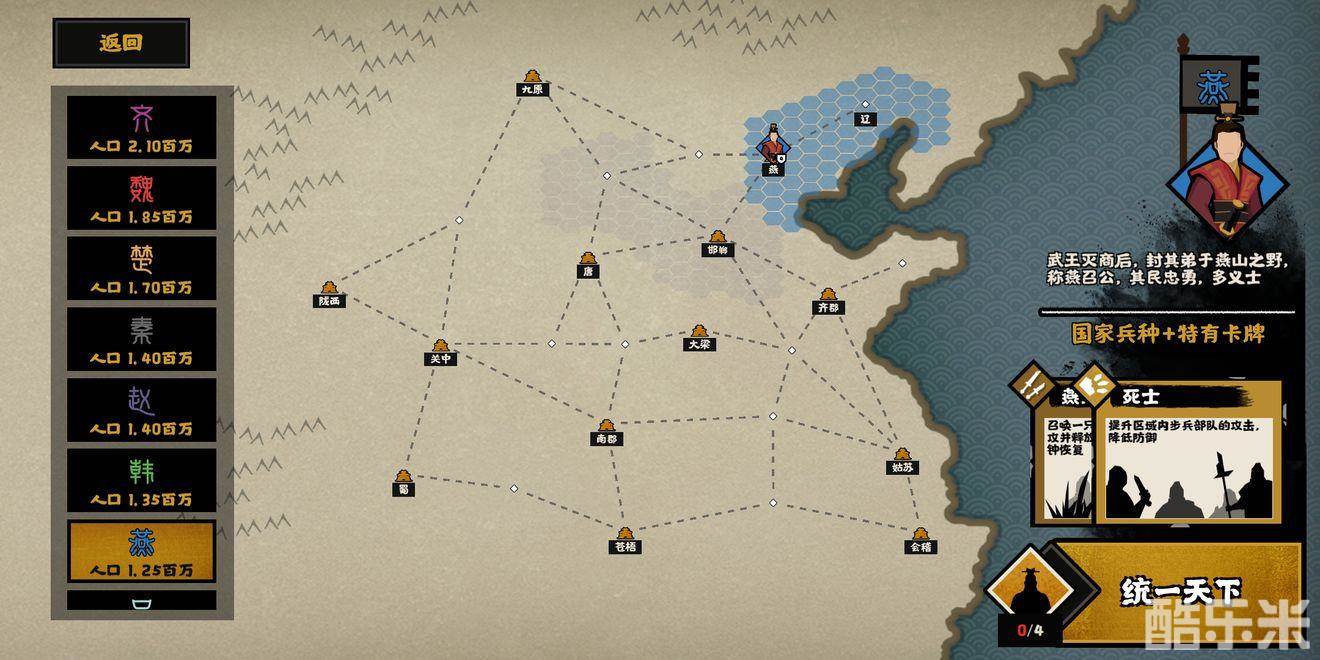 首先燕国,这国家右上角,开局带一个小城池,点完民生里两个发展的,直接打边上那个村子。这时候兵应该不多,先苟着。期间点出偷窃,这模式bug级技能。因为我基本没点农田,点的军队偏多。直接偷,左上角九原,反复偷,苟着。期间隔三差五天天赵,兵够就打赵,先打他和北戎之间的。别去打北戎,开局她太猛了,手段很残忍。打完持续偷北戎,期间战斗力多点,民生多点。对了,前期把李牧的据守点出来,打架很好用。把赵国的土地全收了,差不多就可以稳一会。因为你兵不怎么多了,避免土地太多没兵。