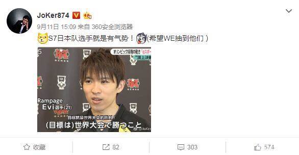 而早在2天前,Joker便在微博表示,希望WE能抽到日本队。