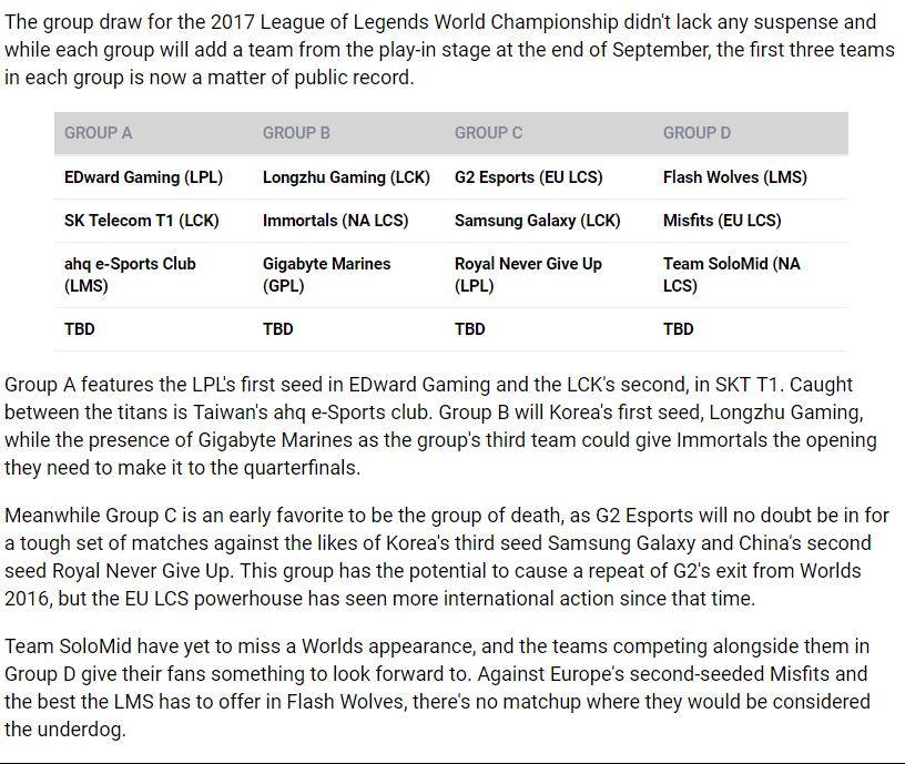 同时,C组目前看来最像死亡之组,因为G2的比赛都将十分艰难,因为他将要面对LCK的三号种子SSG和中国的二号种子RNG。这个组可能重复G2在2016年的历史,不过EU赛区现在比去年更有竞争力。
