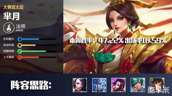 芈月目前的出场率与胜率综合来说算是比较稳定的,英雄本身具有非常强的生存能力在法师英雄中也算是比较突出的一类,不论是一技能的位移效果还是二技能的削弱敌人亦或是大招的无敌效果,都能够在团战中发挥出重要的作用。如果想要提高芈月的胜率,一则是阵容选择一些具有强力爆发的阵容搭配能够在芈月将敌人消耗至残血时进行收割,二则是自身技能的释放实际,多加练习提高二技能的命中率并且掌握好开大招的时机,这样对于芈月的胜率会有显著的提高。