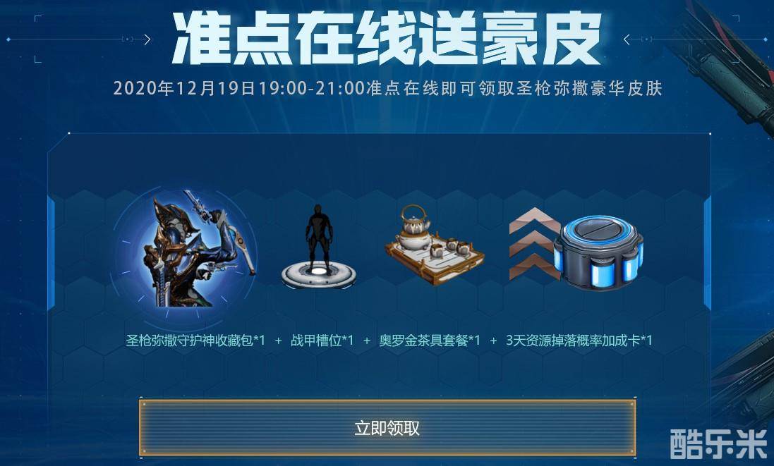 12月19日19:00-21:00准点在线的玩家即可领取圣枪凯撒守护神收藏包、战甲槽位、奥罗金茶具套餐等奖励;同时原有的“开服周六双倍经验”也将比原来延长一个小时,当日19:00-21:00将在《星际战甲》全服开启双倍经验。