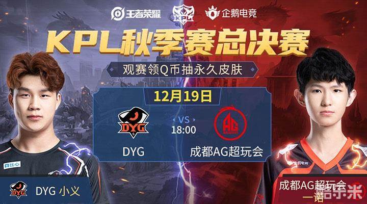 2020年KPL秋季赛总决赛将在12月19日18点在重庆华熙文体中心正式开赛。成都AG超玩会将迎战DYG!今年成都AG超玩会再次进入总决赛舞台,能否斩获冠军?DYG首次挺进KPL总决赛、能否成功刷新战队历史,创造辉煌?王者之战、巅峰对决!究竟谁能成功夺冠?看AG主场!请锁定企鹅电竞KPL官方直播间【58124】,不见不散!