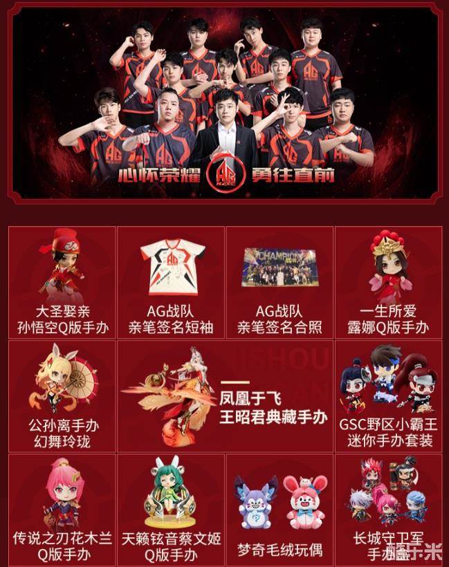 总决赛来企鹅电竞直播间【58124】为AG加油助威将有机会获取AG战队限量亲笔签名短袖、AG限量版应援牌以及多达15种王者周边限定手办!