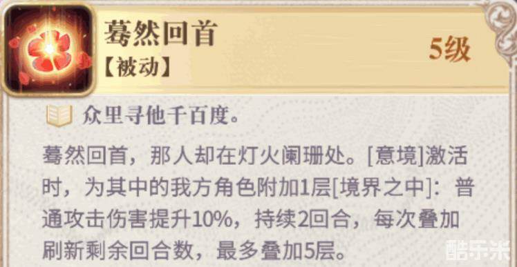 在这个队伍中,主要以音子的普攻伤害为主,因此还可以搭配蓦然。蓦然的被动蓦然回首,能增加普攻伤害,最多增加5层即50%。