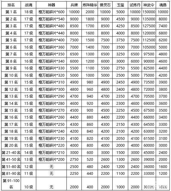 (5)排行榜前50名,如活动期间累计充值未达到50000金币,则橙色神器碎片会更换为一半数量的紫色万能碎片;