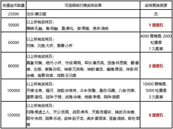 1、活动期间,累计充值金币数量达到对应金额,可以联系在线客服申请1个排行榜武将奖励,或对应金额的进阶酒或澄源石奖励;