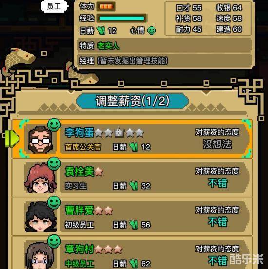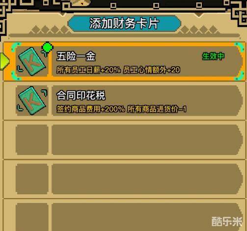 这个财务卡前期一定要选,让你能省好多钱,因为一个员工的笑脸至少要工资满意才会出现。但加了它!你会发现你只给普通他也不会差评你。