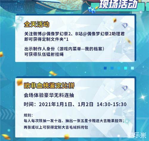 在2021年1月1日~2日漫展期间,关注《偶像梦幻祭2》官方微博@偶像梦幻祭2、B站@偶像梦幻祭2助理君,即可获得定制文件夹*1。同时,现场点击游戏内菜单-我的档案,向工作人员出示制作人身份,即可获得队伍镭射挂绳!