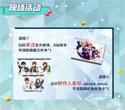 漫展期间,关注《偶像梦幻祭2》官方微博@偶像梦幻祭2、B站@偶像梦幻祭2助理君,即可获得定制文件夹*1。同时,现场点击游戏内菜单-我的档案,向工作人员出示制作人身份,即可获得随机角色透卡*1。期待各位制作人的踊跃参与!