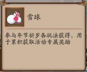 参加“年节祈岁”相关活动,即可获得活动道具“雪球”。