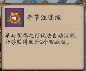 战斗中参战式神不会获得经验,每场战斗有2个观战位,观战式神可以获得大量经验。购买“年节注连绳”可以额外获得2个观战位置。