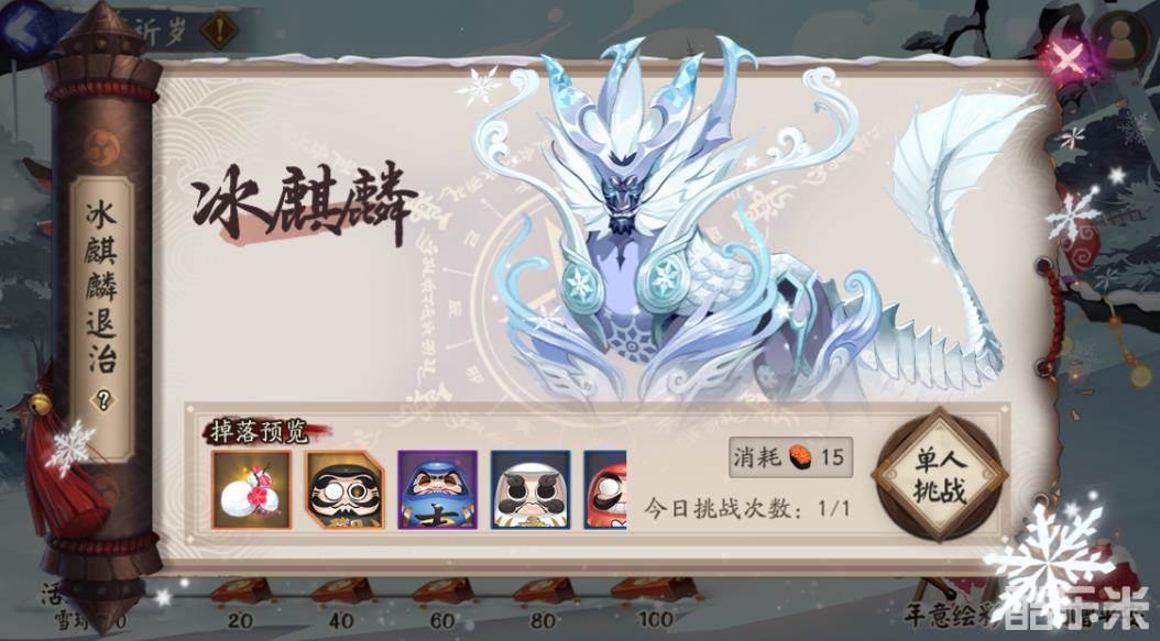 活动期间,阴阳师们每天可挑战1次冰麒麟BOSS。
