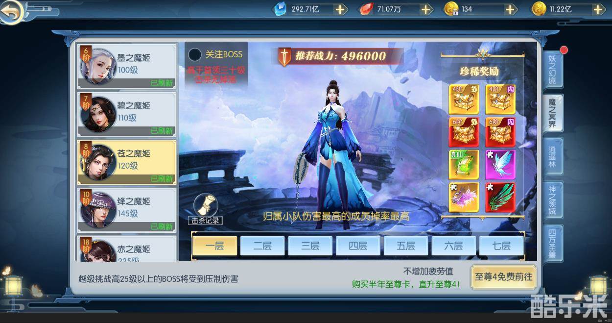 魔之冥界里的首领没有boss疲劳值,但是需要玩家达到要求的至尊等级,充值至尊可无限挑战首领,获得更多boss奖励~