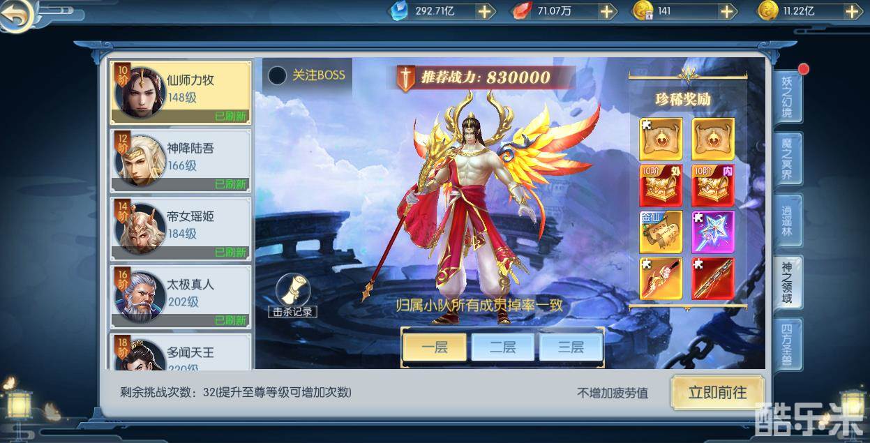 神之领域共三层,层数高的首领力量更强,建议达到推荐的战力挑战,层数越高击败首领的奖励越好,想要得到更好奖励的玩家可以去挑战。