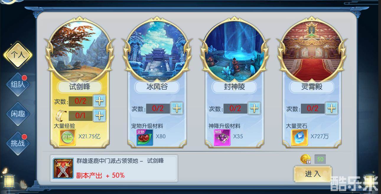 四个副本中试剑峰与凌霄殿类似,里面以小怪为主,产出资源也是我们最需要的资源,冰风谷与封神陵里面只有一个BOSS怪产出主要是神降与宠物升级的材料。以试剑峰为例谈谈如何高效的通过个人副本。