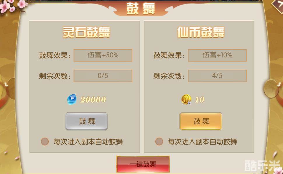 鼓舞:最高能增加100%的伤害加成,需要的物资是灵石和仙币,一般灵石这边需要点满,仙币足够的话也可以看着点,毕竟有了等级你才能更强!