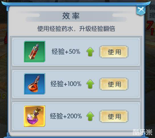 效率:试剑峰专属,在效率里面可以使用经验药水,最高可以获得200%的经验加成,一般打试剑峰最少要使用一个100%的经验加成,因为试剑峰的次数很珍贵。