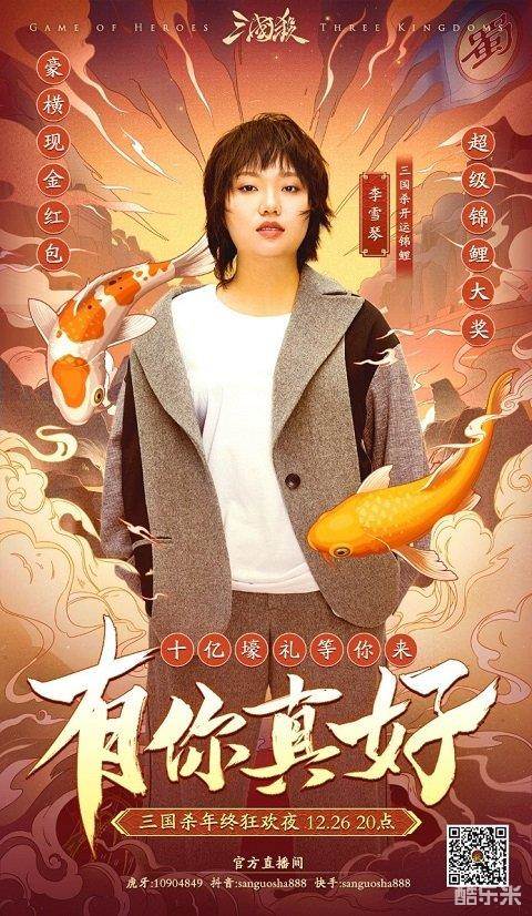 12月26日晚上8点,虎牙、抖音、快手《三国杀》官方直播间,年终狂欢夜即将开启!看“开运锦鲤”李雪琴用脱口秀燃爆全场!赢取海量游戏礼包、豪横现金红包、史无前例的全皮肤锦鲤大奖!认准直播间,助你爽快领福利: