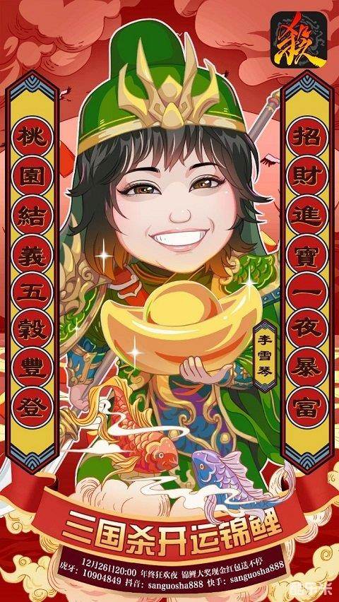 英雄谋略谁能敌,狼烟四起现锦鲤。在2020年即将进入尾声的时候,大家都纷纷转发起了各路锦鲤,期盼新年的到来。而专属于《三国杀》的开运锦鲤,也将在年终狂欢夜现场现身!12月26日晚上8点,虎牙、抖音、快手《三国杀》官方直播间,年终狂欢夜即将开启! 三国杀开运锦鲤“李雪琴”空降直播现场,送上三国杀专场脱口秀首秀!除此之外,直播现场还将送出海量游戏礼包、豪横现金红包以及史无前例的全皮肤锦鲤大奖!更有配音秀、水友赛等精彩环节一并奉上,期待各位主公前来赴宴!认准直播间,带你第一时间找到锦鲤,领取海量惊喜福利