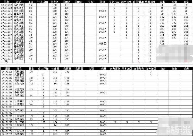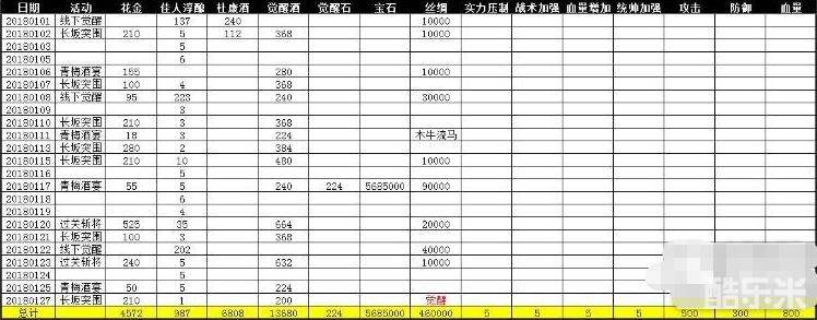 几个关键数据:前后耗时3个月多点(这个因人而异,参考意义不大),每天协助封地拿酒(弱国每天要被打掉不少),所有的觉醒活动都适当花点小金(100金以内),逢线下觉醒适当多做点(一般拿到600瓶的buff),累计花费4572金。最终喝了987瓶佳人淳酿,6808瓶杜康,13680瓶觉醒酒,224觉醒石,5685000宝石,累计觉醒4146次,拿了46w丝绸,7围全满+双宝物。中间有15天外出,没有记录,不过点的次数不多,因此光荣的月英硬醒上限在4200次左右。